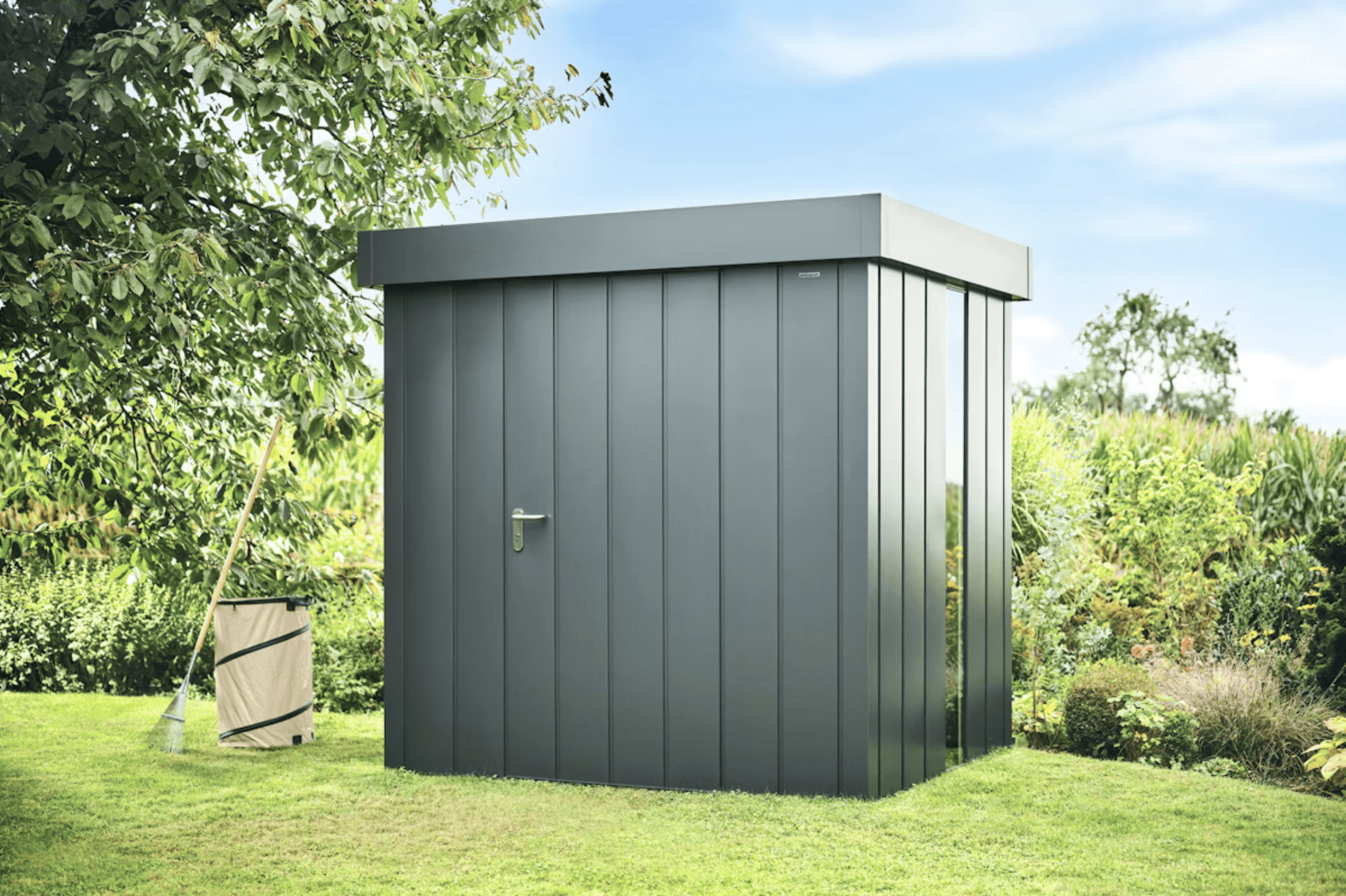 Ruimtevol tuinopbergsysteem met plat dak en toebehoren, vanaf €1.949 excl. montage.